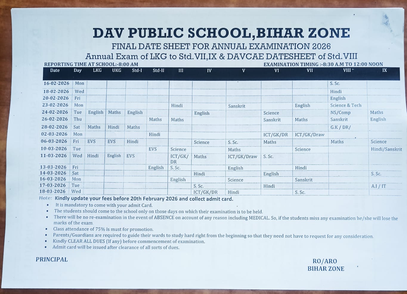 Date Sheet for Std. LKG - VII & IX Annual Examination {Session 2025 - 26}
